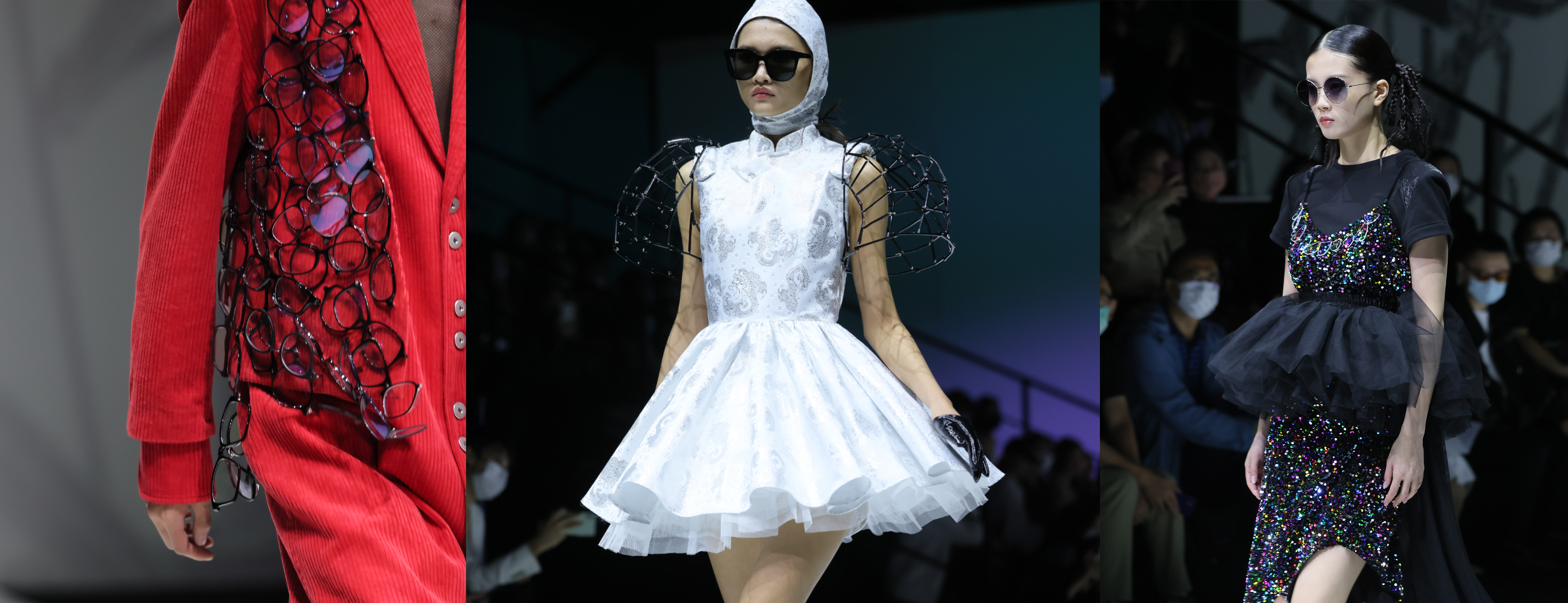 在充满民族特色的盘扣、绣片和少数民族的纹饰的设计中,加入废弃镜框、镜腿和镜片,用链条和隔珠将镜腿变成吊坠或是流苏;将若干镜腿拼接成中国传统服饰中的云肩造型和袖子上的几何图案;在龙纹面料上将彩色亮片和镜片进行叠合,镜片内外虚实交错,展现高度近视者眼中看到的朦胧世界。